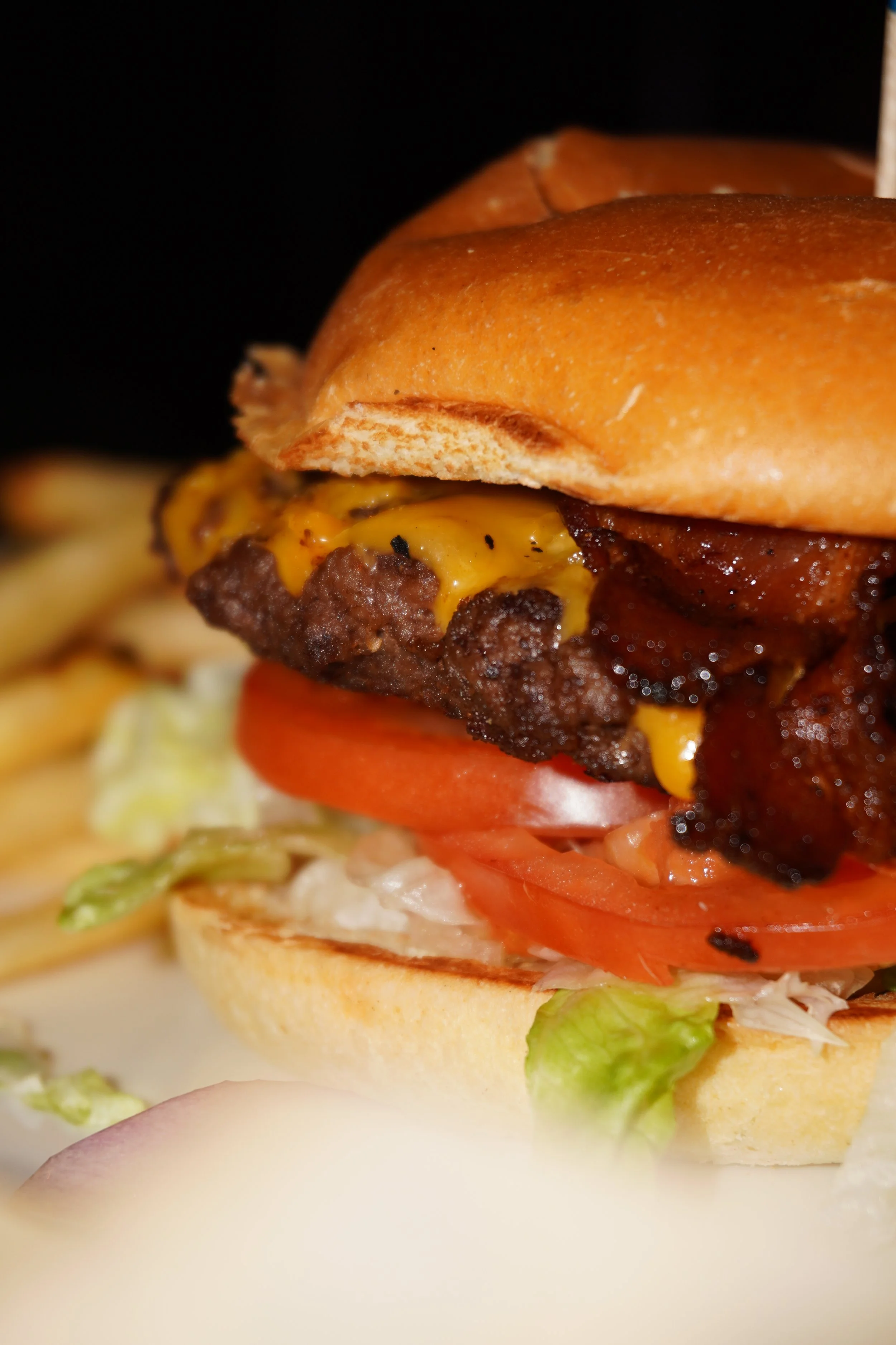 Maritime beef, lettuce, tomatoes, blended cheese, pickles, garlic mayo, bacon