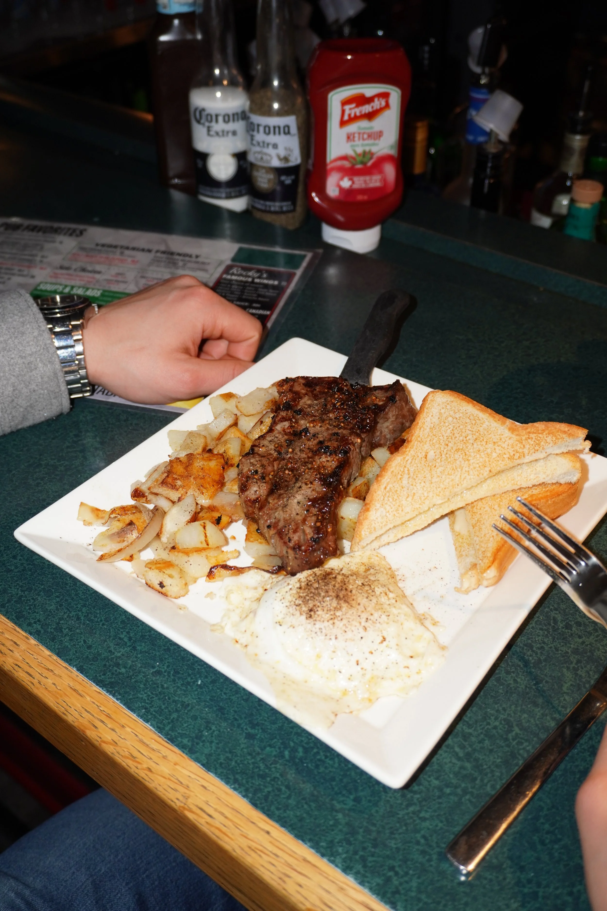 $8oz chargrilled AAA striploin, 2 eggs, home fries, choice of toast